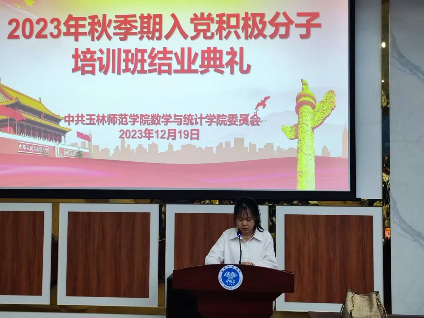 12月19日下午,太阳成集团tyc122cc于新民楼D101举行2023年秋季期入党积极分子培训班结业典礼,该公司党委书记庞伟、党委副书记李秀英、团委书记周美艳、党委专职组织院陆发焕、员工党支部书记、专职辅导员及第十五期入党积极分子参加典礼,由员工第一党支部书记丘夏薇主持。