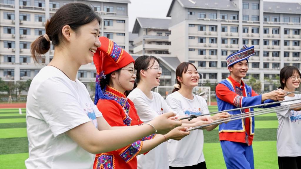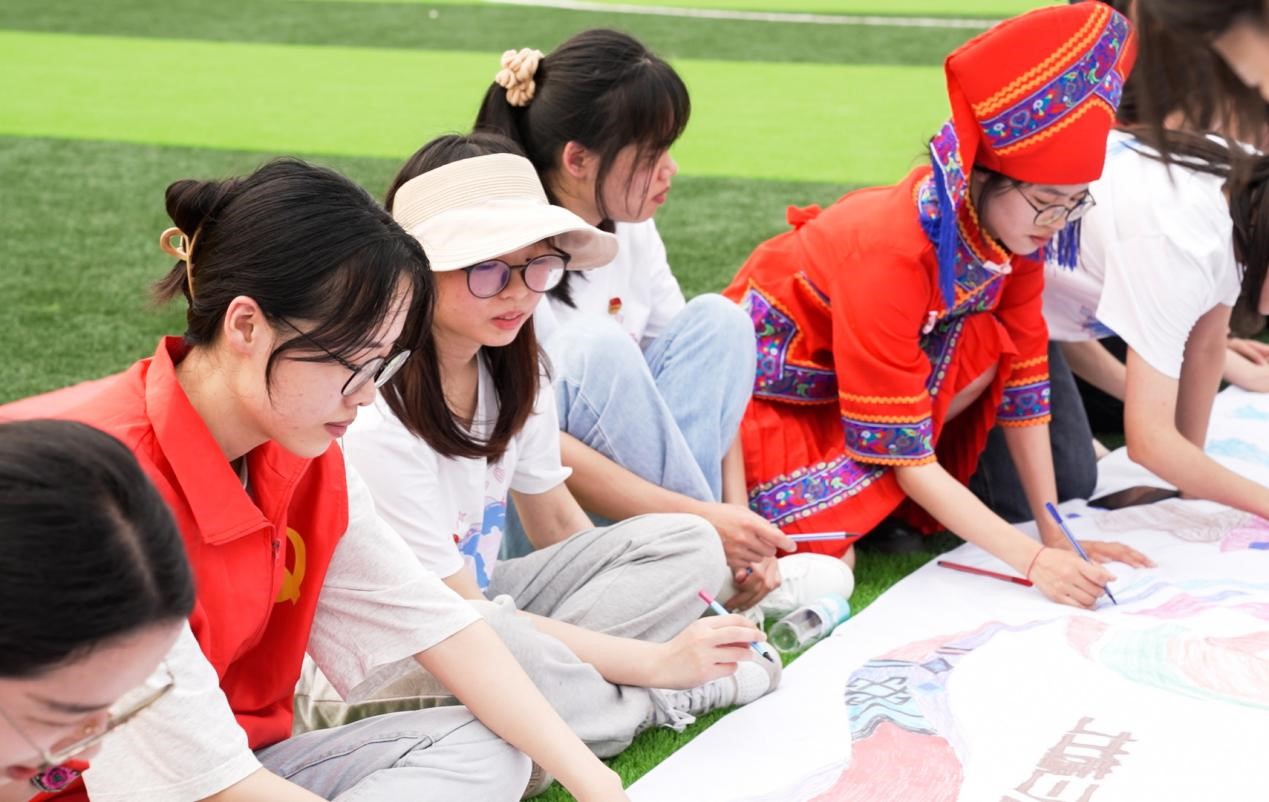 活动围绕“秀在壮乡、绘在壮乡、唱在壮乡......等主题开展了民族服饰走秀、三月三画卷涂鸦、传瓶子听民歌竞猜、抛绣球比赛、同心鼓游戏等活动。随着音乐迈着动感的步伐,身着民族特色盛装的同学们为大家展示着民族服饰的风韵,展现各族人民相亲相爱的人文风情;“壮族三月三”不仅是民俗文化的传承,更是民族精神的传递,师生通过共绘三月三画卷,表达对民族精神文化的热爱,对中华传统文化节日到来的喜悦与赞美之情。活动在一首首壮乡民歌中走向高潮,点燃了“三月三”的节日氛围......此次活动,使师生领略到了壮族优秀传统文化的魅力,也感受到了民族团结的精神力量,同时激发了对生活和对民族的热爱之情,增强了文化自信,坚定了理想信念。