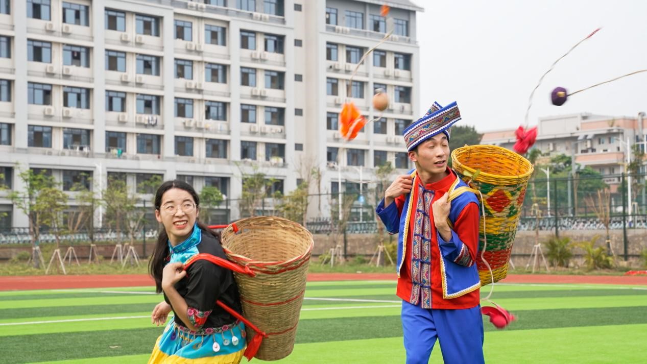 庞伟做了动员讲话,介绍了壮族“三月三”的由来以及壮乡美食五色糯米饭、壮乡传统服饰、对唱山歌、抛绣球等有关“三月三”的节日文化,让同学们了解壮族优秀传统文化的同时,深深感受中华民族传统文化的博大精深。他希望师生多了解“三月三”的传统历史,将“三月三”传统文化与中华经典古诗词结合传承,在特色的民族活动中培养顽强拼搏、团结协作、乐观向上的精神。