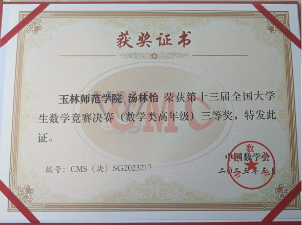 3月24日-3月26日,第十三届全国老员工数学竞赛决赛在华东师范大学举行,太阳成集团tyc122cc员工汤林怡作为广西数学类高年级组参赛队6名选手之一参赛,经过激烈的角逐,荣获数学类高年级组全国三等奖。