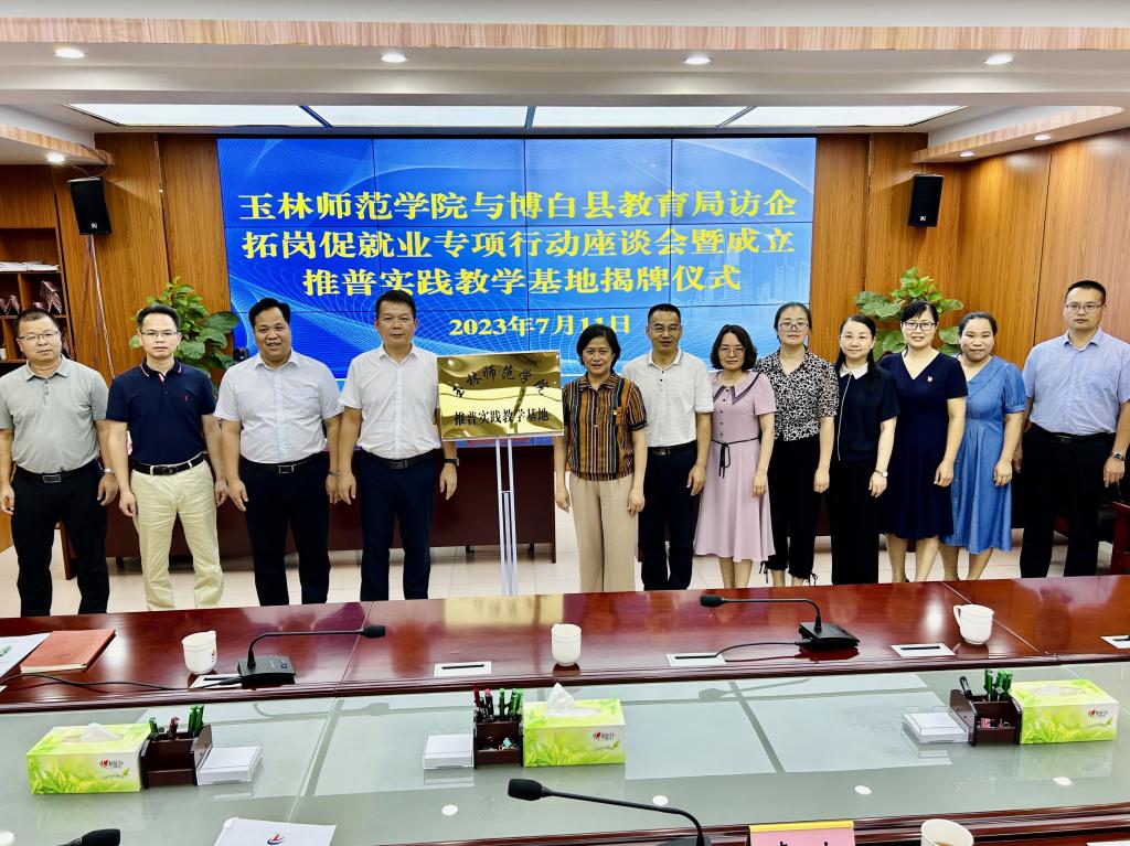 庞国萍和卢山共同为推普实践教学基地(博白站)揭牌。随后,与会人员围绕《博白县教育质量提升“加速跑”行动计划(2023-2025年)》进行了交流探讨,双方就师范生培养、员工实习实践、就业创业以及联合共建名师工作坊、培育基础公司产品成果等方面进行和深入交流,并达成初步合作意向。