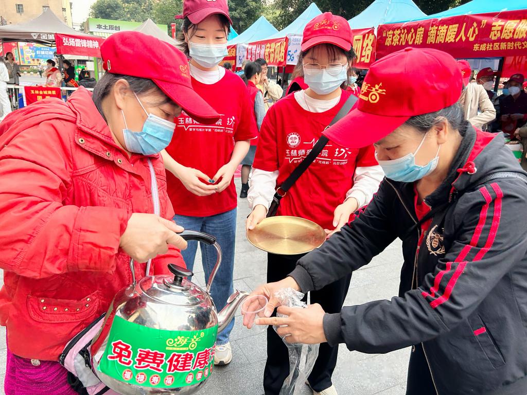 活动现场,老员工志愿者分成小组,积极参与到玉林市城市管理监督局、玉林市中心血站、玉州区人民检察院、中国邮政储蓄银行玉林市人民东路营业所等单位政策和法律法规宣传工作队伍中。